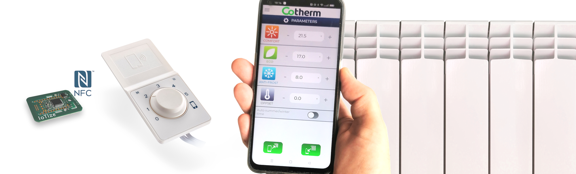 Cotherm, with no prior experience with NFC adopted IoTize's NFC solution for rapid implementation in their new controller design. These controllers provide an easy-to-use graphical interface via smartphones, combined with NFC tap-to-connect ease of use.